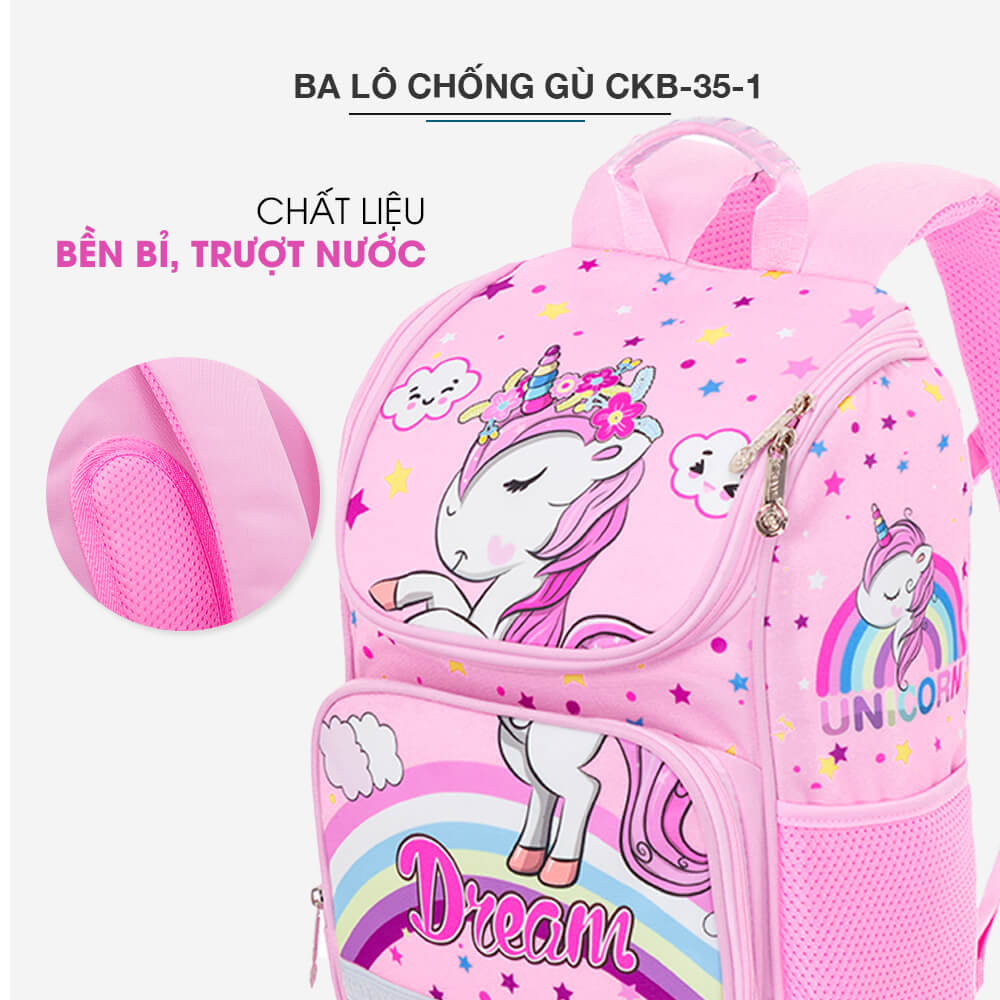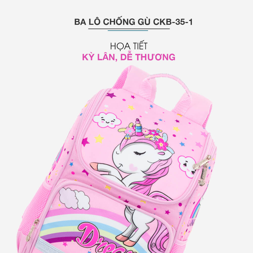 Ba Lô Chống Gù CKB_35_1 thiết kế dựa trên sở thích của trẻ nhỏ, sử dụng tạo hình là thú kỳ lân xinh xắn khơi gợi hứng thú và rèn luyện khả năng tư duy trừu tượng của bé.