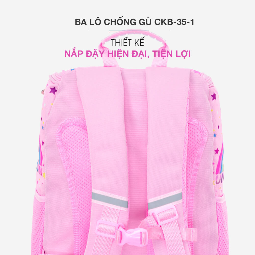 Ba Lô Chống Gù CKB_35_1 có thiết kế thông minh, các điểm lồi lõm trên mặt lưng balo được thiết kế theo hình dạng phù hợp với vai, lưng và cột sống của bé, hỗ trợ phân tác trọng lực và giảm thiếu các tình trạng gù lưng, đau vai, mỏi cổ không mong muốn như khi sử dụng các sản phẩm balo thông thường. Ngoài ra, phần quai đeo và đệm lưng này còn được lót 1 lớp đệm dày, thoáng khí và siêu êm ái dù bé sử dụng trong thời gian dài.