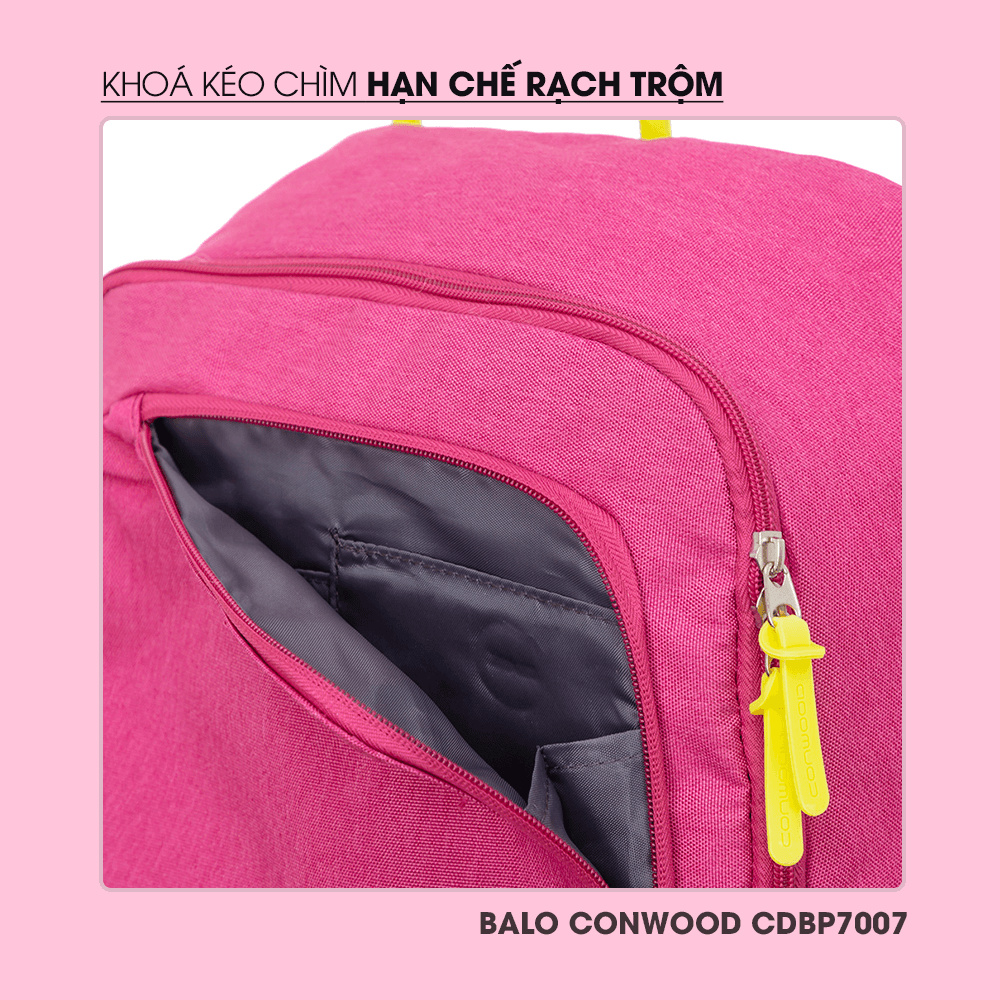 Ngăn chứa của Balo Conwood CDBP7007 được tích hợp hệ thống khoá kéo thiết kế âm chìm giúp chống thấm do tác động thời tiết, ngoài ra hạn chế được tình trạng rạch trộm dây kéo.