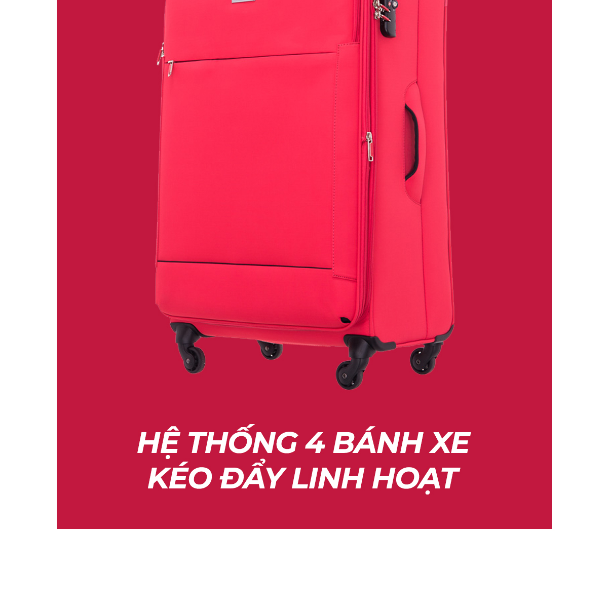 Vỏ bánh xe làm bằng cao su thiên nhiên đúc nguyên khối, bọc quanh khung nhựa cứng có lỗi cốt thép đặc bên trong, hạn chế ma sát với mặt đường, hỗ trợ điều hướng vali, giúp di chuyển sản phẩm êm ái, không gây tiếng ồn. Tất cả đều tích hợp trong chiếc bánh xe bé nhỏ được sản xuất bởi nhà máy Hinomoto (Nhật Bản).