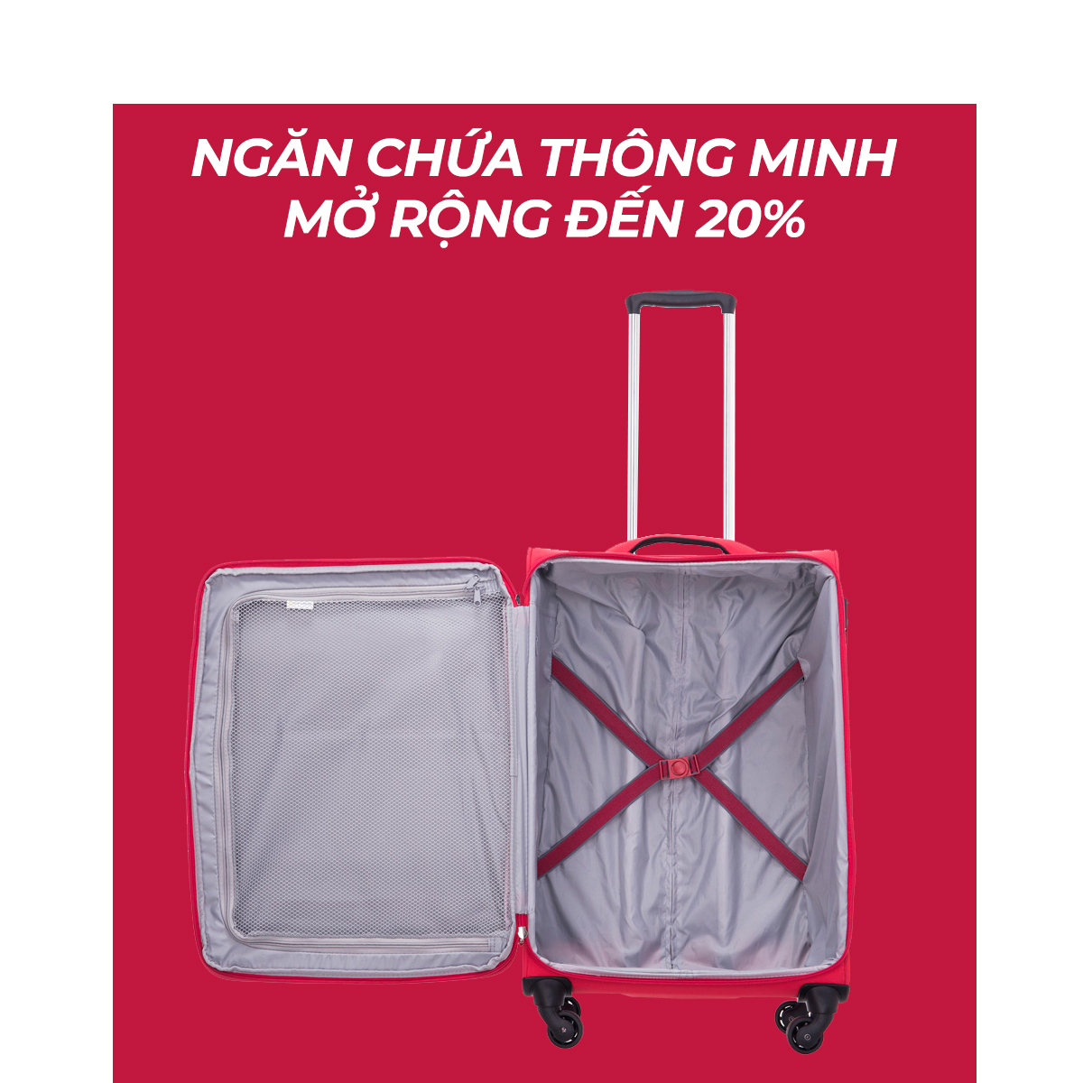 Vali du lịch thời trang CT563 sẽ mang đến bạn những trải nghiệm tốt nhất bởi nội thất được thiết kế khoa học với ngăn hành lý lớn lót đệm mút thoáng khí, khóa kéo vòng tiết kiệm diện tích tối đa. Ngăn hành lý phụ được bọc lưới tách biệt và ngăn phụ kiện chuyên dụng nằm ở vị trí vách ngăn tiện lợi. Đặc biệt, sản phẩm tích hợp ngăn kéo mở rộng gia tăng thể tích chứa lên 20% cho phép bạn chứa thêm một lượng hành lý mang theo thật thoải mái.