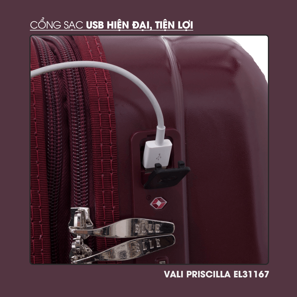 Để đảm bảo cho các thiết bị điện tử của bạn luôn được đầy pin sử dụng, Vali Elle Priscilla EL31167 được tích hợp thêm cổng sạc USB thông minh và tiện lợi, có thể cắm sạc mọi lúc trong chuyến đi. Tuy nhiên do một số quy định về hành lý, cổng sạc USB chỉ được tích hợp trên vali size xách tay (cabin).