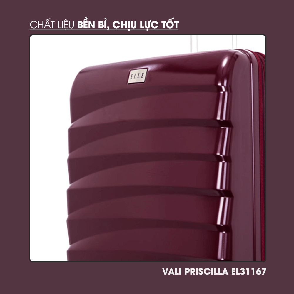 Vali Elle Priscilla EL31167 được làm từ chất liệu nhựa PC với đặc tính bền bỉ và chịu lực cực kỳ tốt, phù hợp với nhu cầu dịch chuyển thường xuyên mà không sợ chiếc vali bị hư hỏng hay bể vỡ. Bên cạnh đó chất liệu này còn giúp sản phẩm giữ được độ tươi mới của màu sắc.